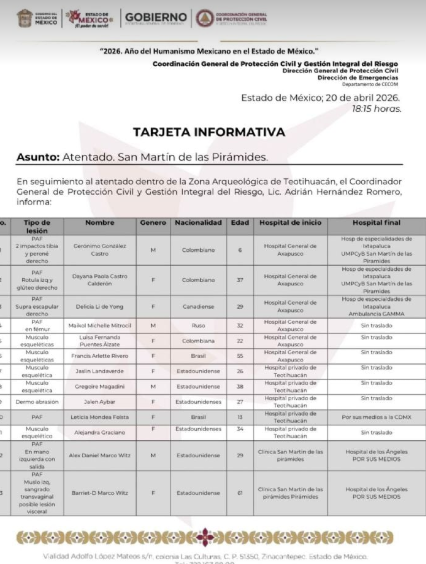 ESTADO DE MÉXICO — El Gabinete de Seguridad Nacional confirmó que el saldo del tiroteo registrado en la Zona Arqueológica de Teotihuacán es de 13 personas de origen extranjero lesionadas. Las víctimas, de diversas nacionalidades, ya reciben atención médica en hospitales públicos y privados de la región y la Ciudad de México.