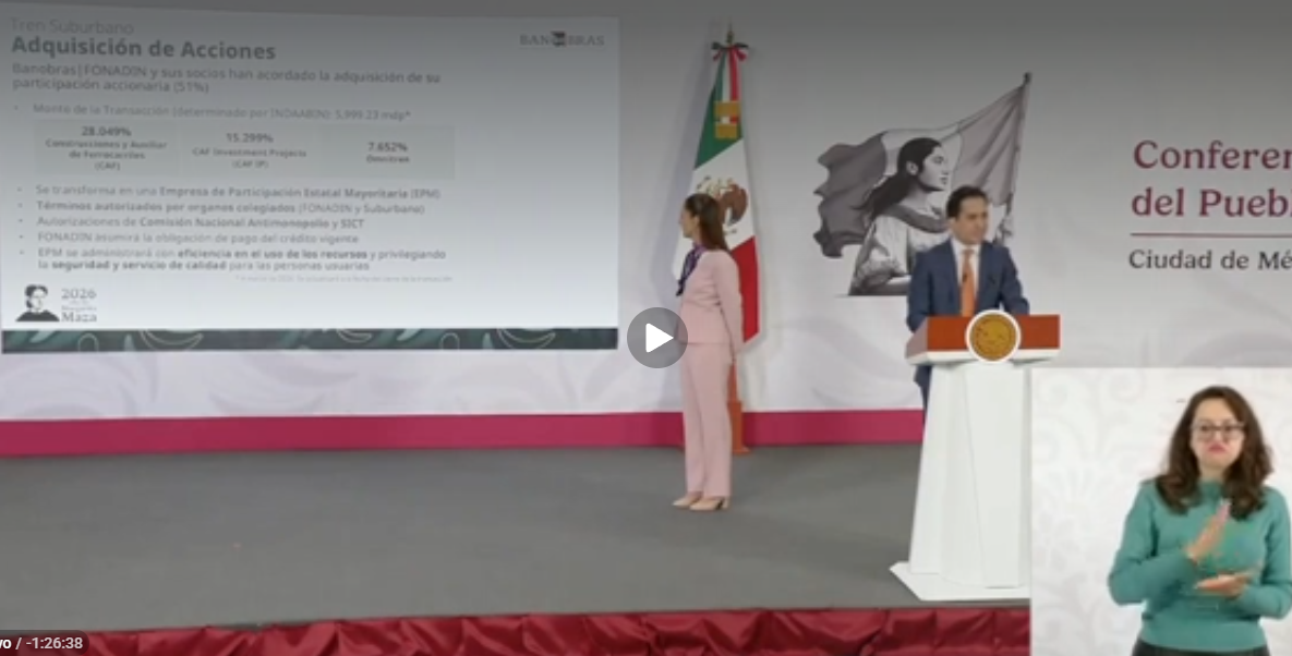El Gobierno de México recuperó el control mayoritario del Tren Suburbano tras concretar la adquisición del 51% de las acciones que pertenecían a la empresa española CAF. La operación, que marca la transición de la gestión privada a la pública, tuvo un costo de 5 mil 999 millones de pesos, según informó Jorge Alberto Mendoza Sánchez, titular de Banobras.