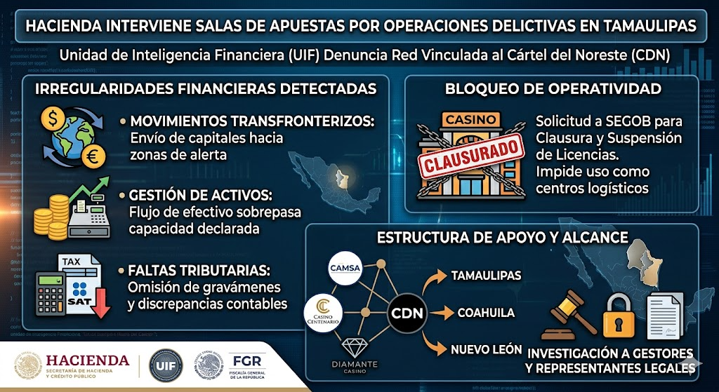 La Secretaría de Hacienda, por conducto de la Unidad de Inteligencia Financiera (UIF), ha procedido legalmente contra una estructura de casinos utilizada por el Cártel del Noreste para el blanqueo de activos y la defraudación fiscal. La denuncia, presentada ante la FGR, expone un sistema de triangulación de recursos que operaba bajo el amparo de establecimientos comerciales.