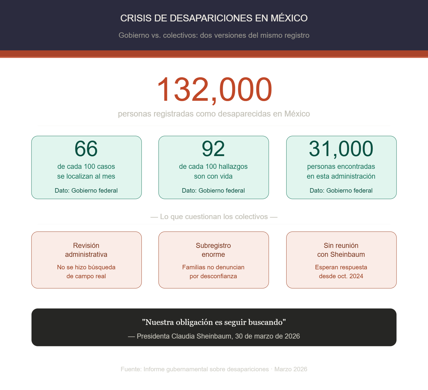 El gobierno reporta 132 mil personas desaparecidas en el registro nacional y presume que, de cada 100 casos abiertos en un mes, 66 se resuelven con una localización, y 92 de esos hallazgos son con vida. Durante la actual administración, afirma haber encontrado a 31 mil personas que ya fueron retiradas del registro oficial.